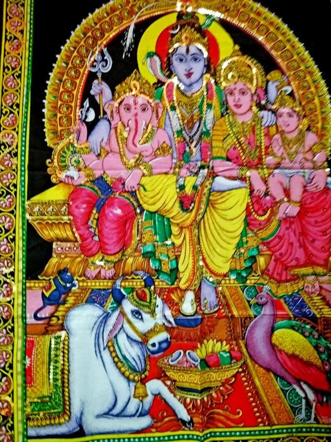 Изображение всей семьи вместе называется Шива Паривар. Семья Шивы - слева на право - Ганеша, Шива, Парвати, Картикея. Внизу - средство передвижения: крыса - у Ганеша, Бык Нанди - у Шивы, Павлин - у Картикея.